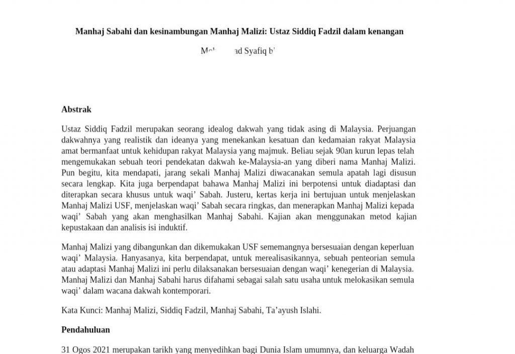 Ketua Biro Dakwah ABIM Pusat, Ustaz Mohammad Syafiq Ismail at-Tauhidi dalam perkongsiannya menyatakan bahawa sudah sampai masanya kita menggagaskan sebuah Manhaj Sabahi yang mengambilkira sejarah umat Islam di Sabah; sebelum kolonial, ketika kolonial, dan pasca kolonial (sekarang).