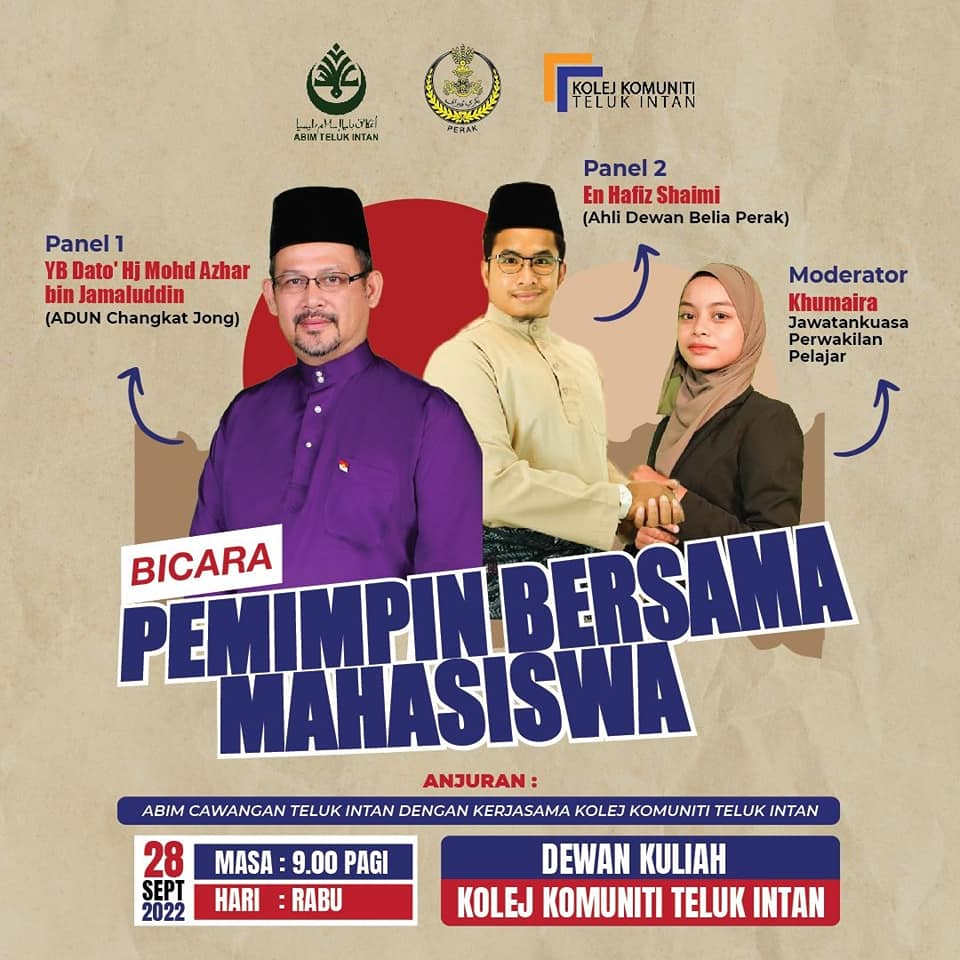 28hb September 2022 (Rabu): Alhamdulillah, ABIM Teluk Intan dengan kerjasama Kolej Komuniti Teluk Intan telah menganjurkan Bicara Pemimpin bersama Mahasiswa.
