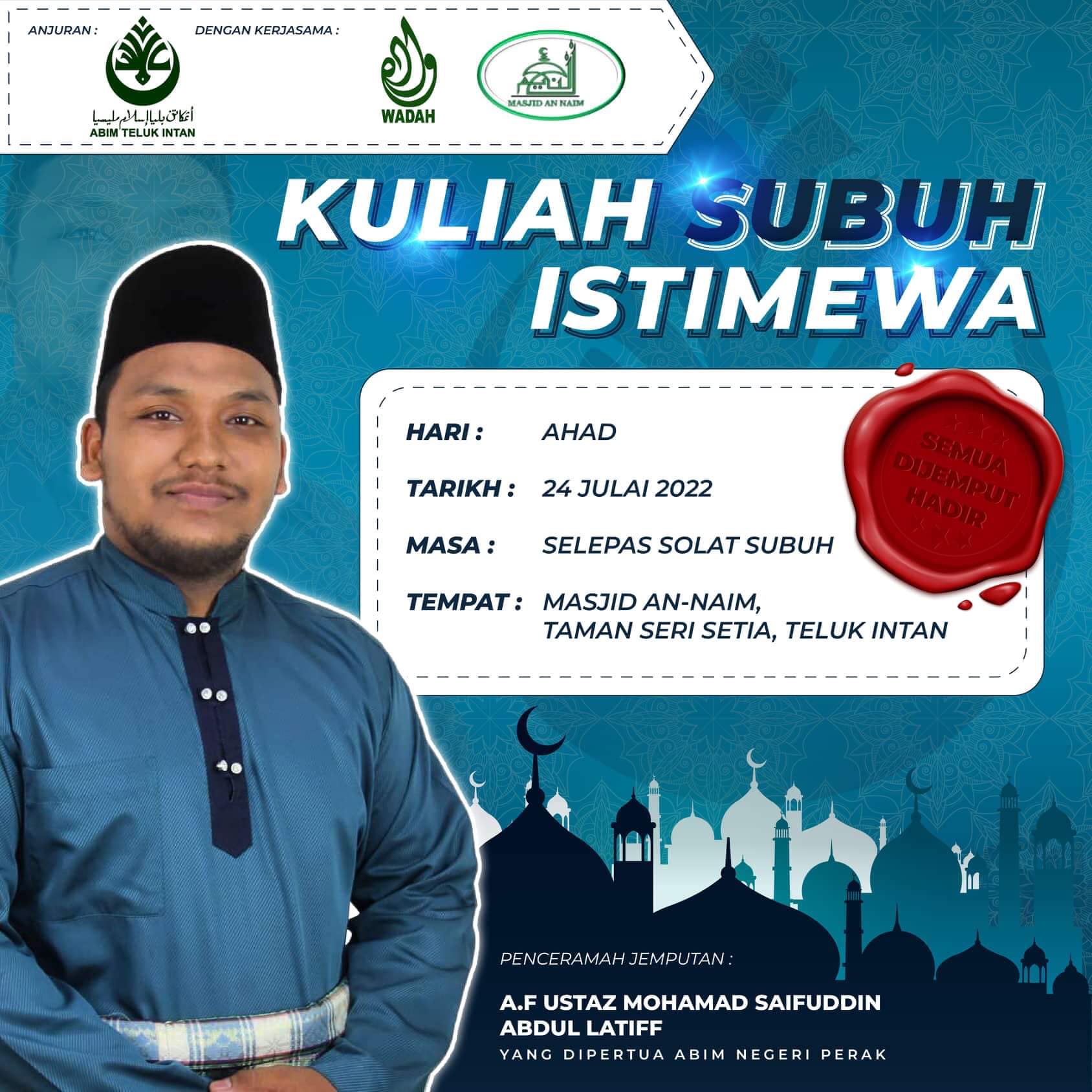 KULIAH SUBUH ISTIMEWA Assalamualaikum Warahmatullahi Wabarakatuh, Seluruh jawatankuasa Angkatan Belia Islam Malaysia (ABIM) dan Wadah Pencerdasan Umat cawangan Teluk Intan menjemput Muslimin dan Muslimat ke majlis ilmu seperti ketetapan berikut…