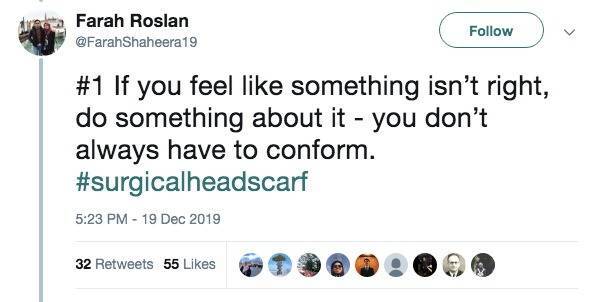 Demi mengimbangi kepentingan aspek kebersihan dan mengurangkan jangkitan kuman di samping masih menjaga bab pemakaian tudung, seorang doktor kelahiran Malaysia, Dr. Farah Shaheera Roslan yang kini bertugas di United Kingdom (UK), menghasilkan tudung pakai buang yang disteril untuk kegunaan hospital.