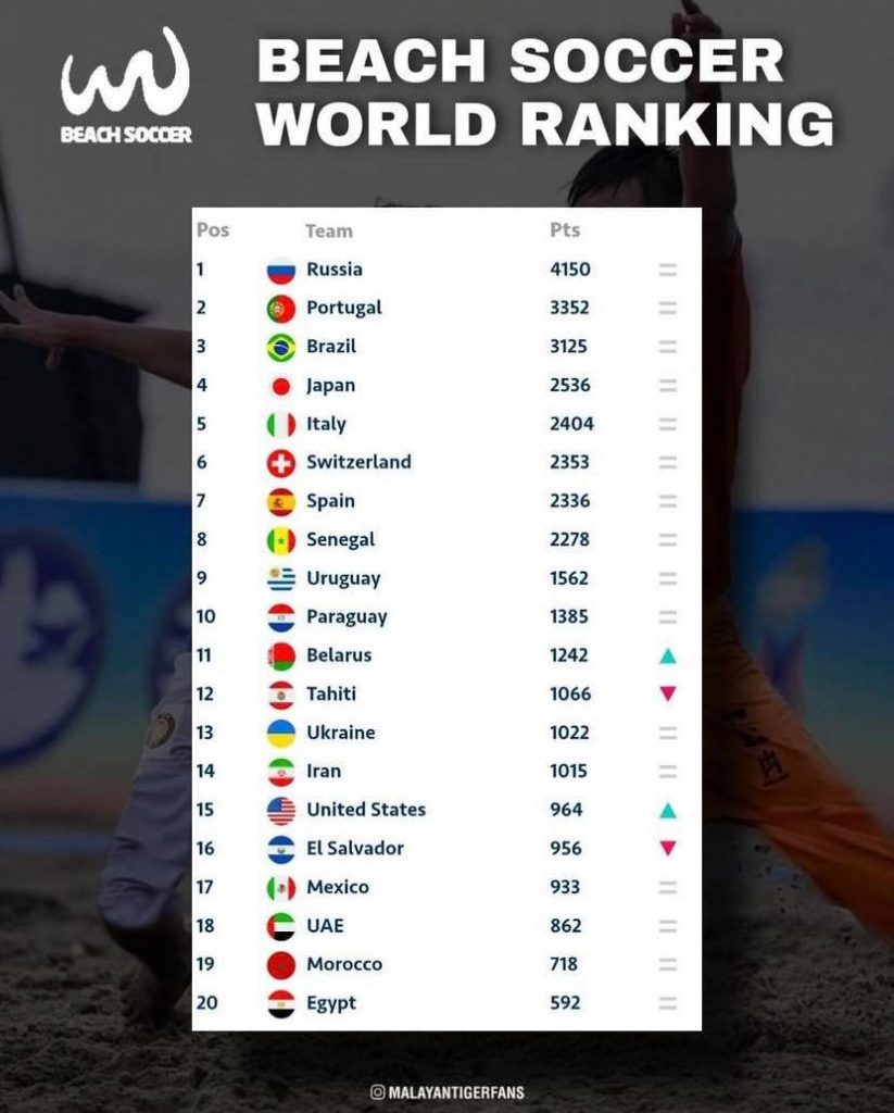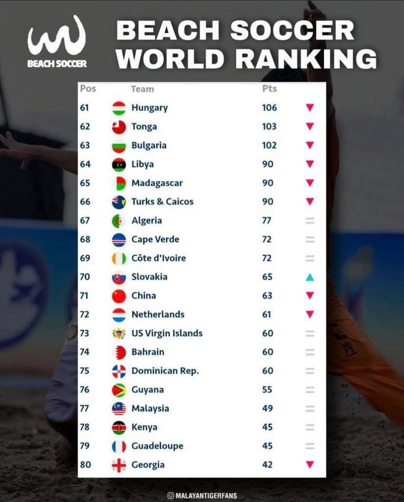 Sebagai rekod, ranking bola sepak pantai pasukan Malaysia adalah nombor 77 dunia. Manakala ranking di ASEAN pula, nombor 1. Semoga satu hari nanti skuad negara dapat beraksi cemerlang pula dalam Piala Dunia FIFA Bola Sepak Pantai, insya Allah. Tahniah!