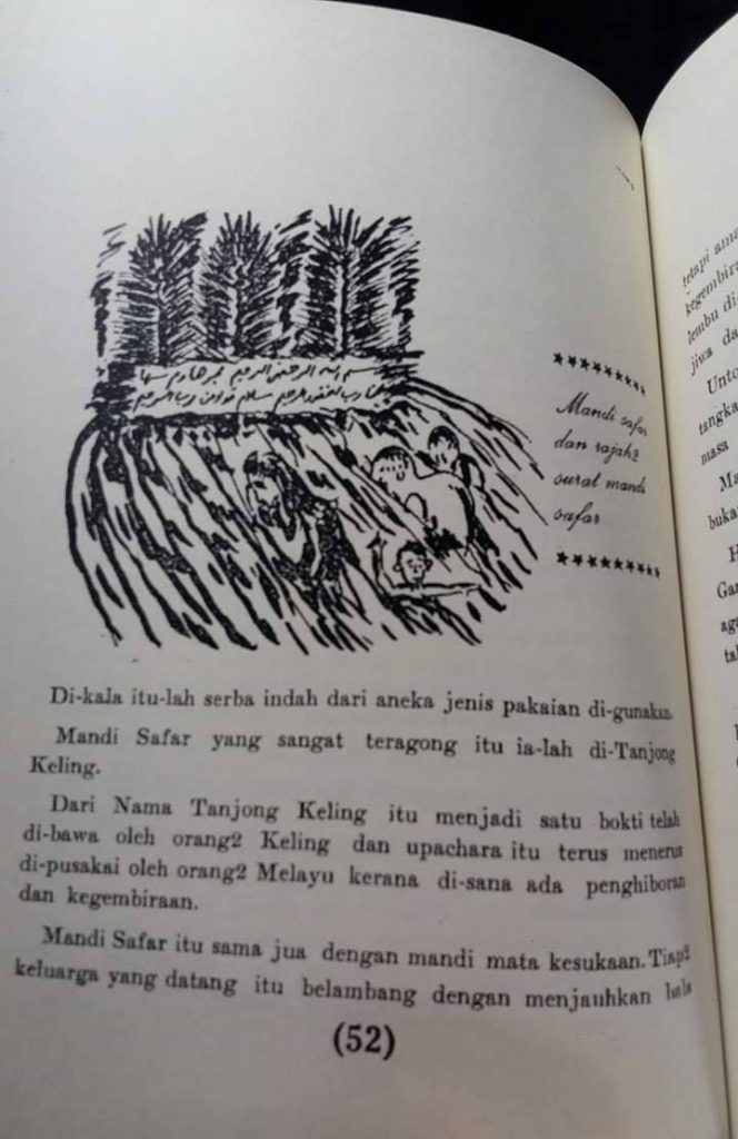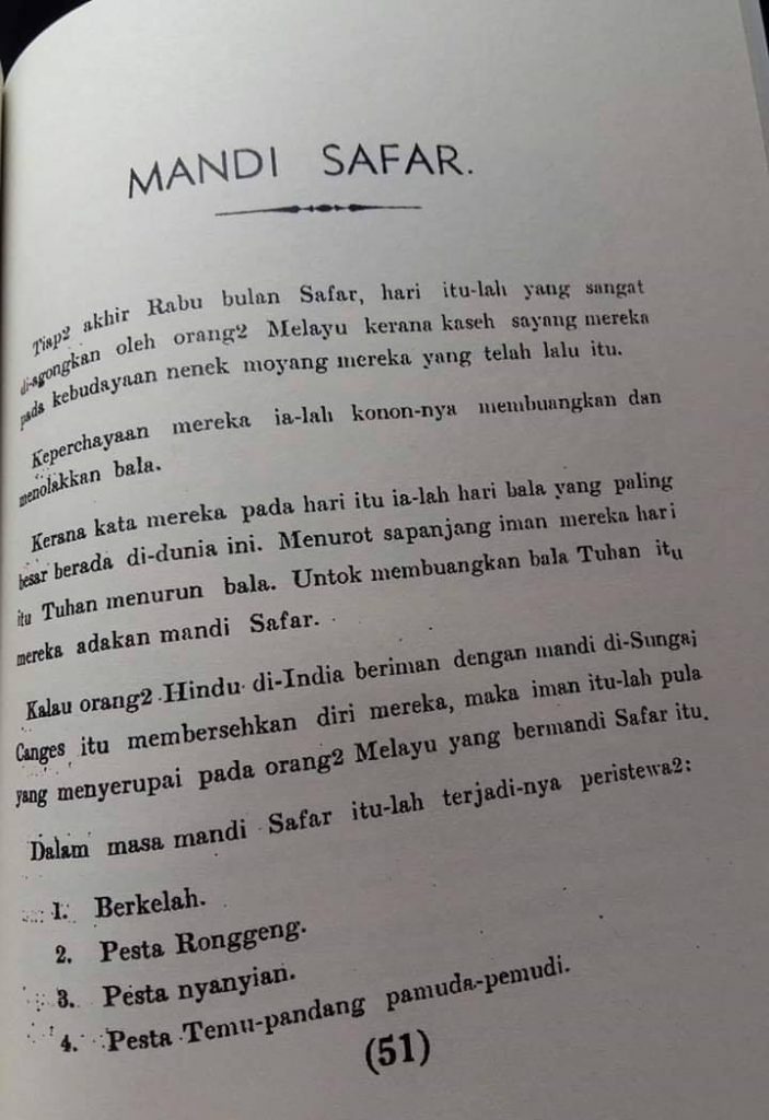 Pada hari Mandi Safar tersebut, orang Melayu ketika itu beramai-ramai turun ke pantai untuk mandi. Kerbau juga akan disembelih untuk ‘dijamu’ kepada ‘roh laut’ agar jangan mengganggu mereka mencari rezeki di laut. Adat ini diceritakan dalam Buku Teks Tata Rakyat utk diajar di sekolah pada zaman itu.