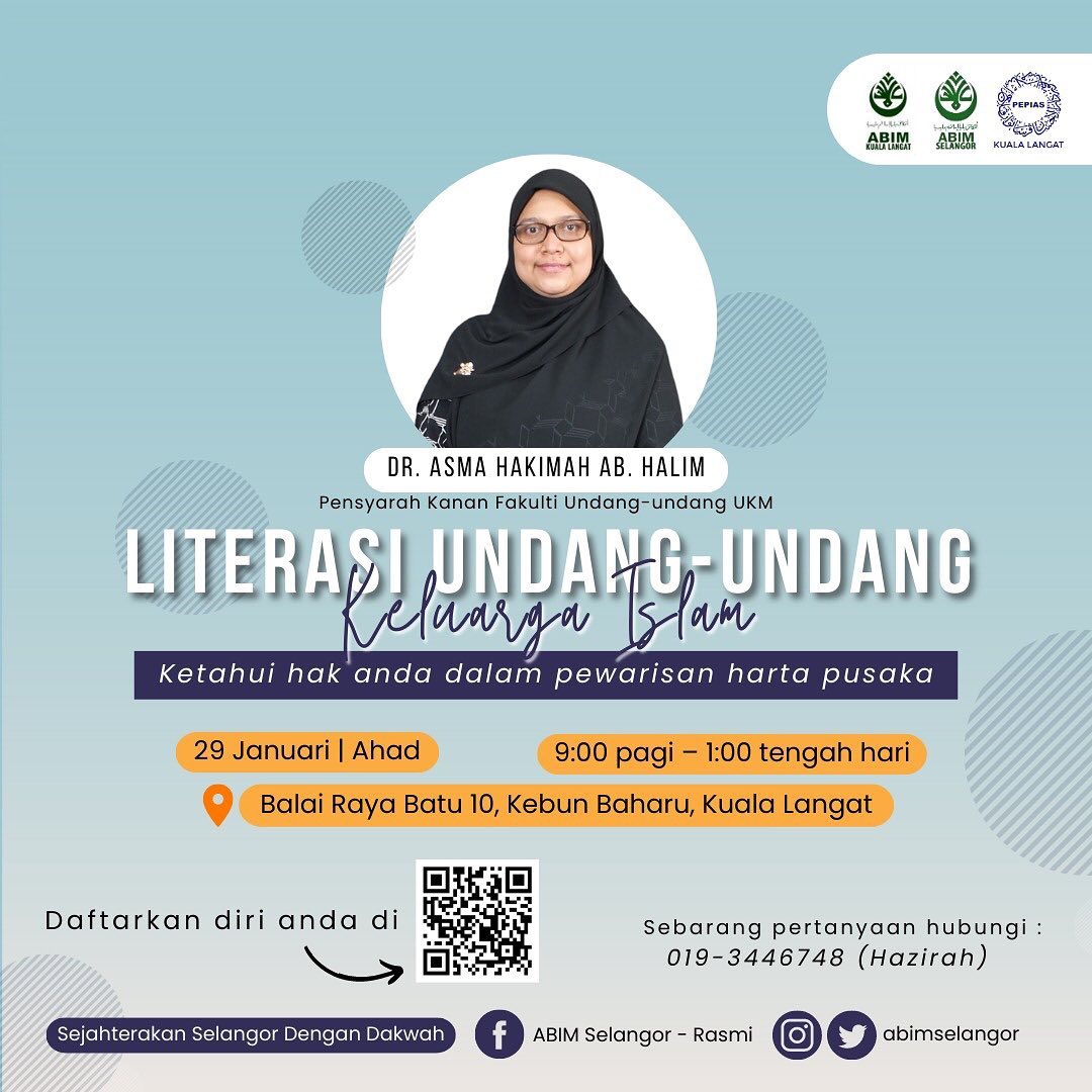 Assalamualaikum wrt wbt 💡Diskusi Ilmiah : Literasi Undang-undang Keluarga Islam Ayuh ketahui hak anda dalam pewarisan harta pusaka pada: 🗓️Tarikh : 29 Januari (Ahad) ⏰Masa : 9 pagi – 1…