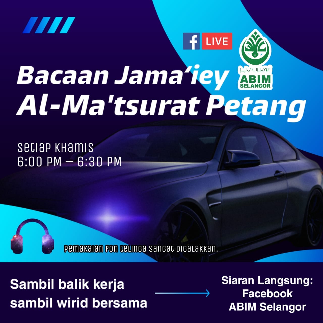 Assalamu‘alaykum wrt. wbt. Bermula minggu ini, in sya Allah, ABIM Selangor akan bersiaran secara langsung untuk memimpin bacaan Al-Ma’tsurat Petang menerusi https://fb.com/ABIMSelangor10 Setiap Khamis, 6:00 petang Sambil memandu atau bersantai…
