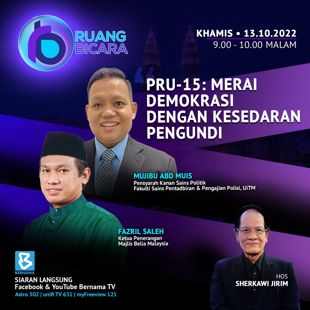 [Ruang Bicara BERNAMA TV] “PRU-15: MERAI DEMOKRASI DENGAN KESEDARAN PENGUNDI” Khamis (13 Oktober 2022)09:00 – 10:00 malam Panelis: 1) FAZRIL SALEHKetua Penerangan MBM merangkap Setiausaha Agung ABIM 2) MUJIBU ABD…