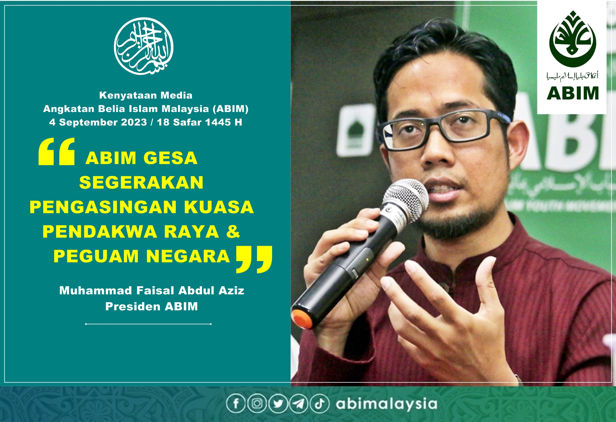 Kenyataan Media – Angkatan Belia Islam Malaysia (ABIM) 4 September 2023 / 18 Safar 1445 H ABIM GESA SEGERAKAN PENGASINGAN KUASA PENDAKWA RAYA & PEGUAM NEGARA Angkatan Belia Islam Malaysia…