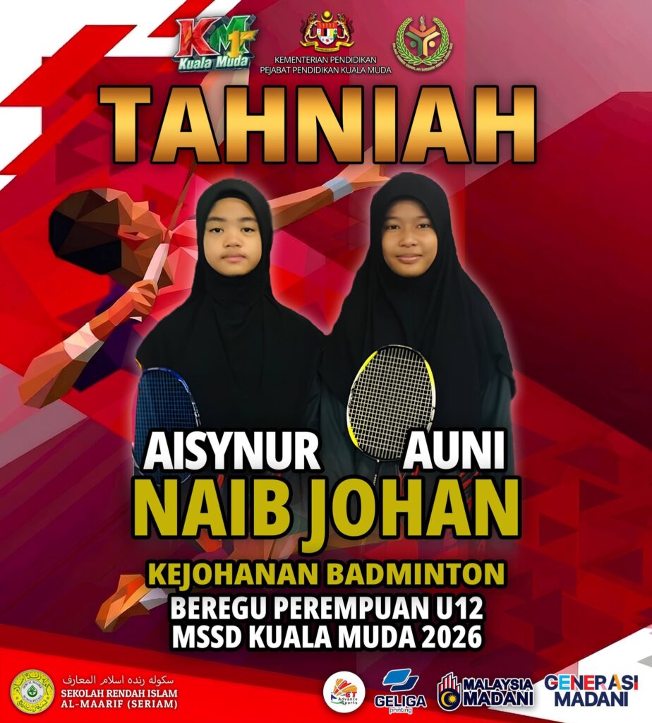 Tahniah diucapkan kepada Aisynur dan Auni atas kejayaan meraih Naib Johan dalam Kejohanan Badminton Beregu Perempuan Bawah 12 Tahun (U12) MSSD Kuala Muda 2026! Usaha, semangat dan kerjasama yang ditunjukkan amat membanggakan. Semoga terus cemerlang dan melakar lebih banyak kejayaan pada masa akan datang! Kepada para peserta lain, jangan menyerah—teruskan berusaha dan berlatih untuk mencapai kejayaan yang lebih gemilang!