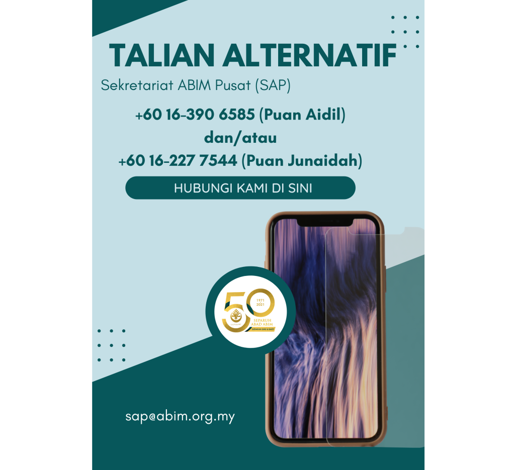 Memandangkan talian tetap Sekretariat ABIM Pusat (SAP) sedang diselenggara, ia tidak dapat digunakan untuk sementara waktu ini. Untuk sebarang urusan dengan pihak SAP, Tuan/Puan boleh menghubungi kami di talian alternatif iaitu: